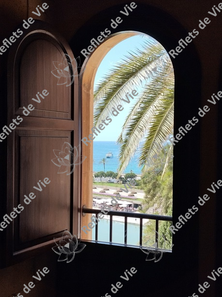 Cette photo capturant une fenêtre en arcade en bois s’ouvrant sur la mer de Palma à Majorque, Espagne, avec des feuilles de palmier ajoutant une touche de verdure, évoque une ambiance méditerranéenne apaisante. La vue imprenable sur l’horizon maritime crée une atmosphère de détente et de voyage. Disponible en téléchargement immédiat après paiement, cette image apportera une touche chaleureuse et élégante à vos projets.